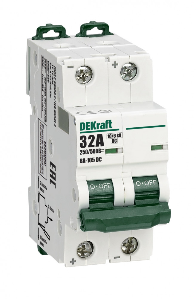 Автоматический выключатель серии ВА-105 DC DEKraft; 2P; ном. ток 32 А; характеристика C; откл. способность Icn = 10 кА при 250 В/6 кА при 500 В; установка – на DIN-рейку; ширина – 1 мод. х 18 мм. Выключатели ВА-105 DC применяются для защиты от перегрузки и КЗ в цепях постоянного тока, в частности в системах автоматизации и управления, транспорта, генерации и распределения электроэнергии и др. Окошко-индикатор всегда показывает состояние аппарата вне зависимости от положения рукоятки управления.