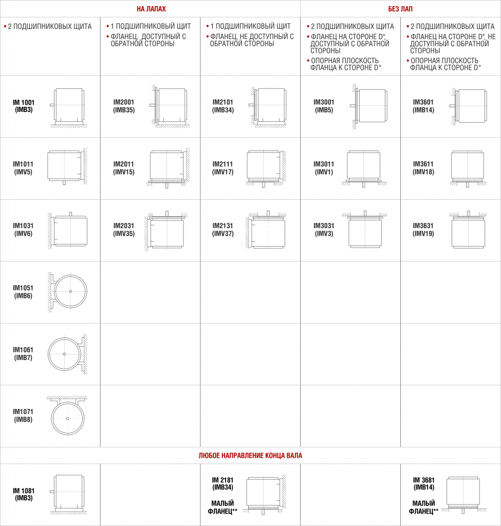 В зависимости от габарита электродвигателя некоторые монтажные исполнения могут быть недоступны. Возможно производство электродвигателей в других монтажных исполнениях, не указанных в таблице.