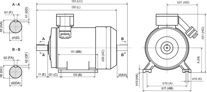 Установочные и присоединительные размеры рудничных электродвигателей совпадают для соответствующих высот осей вращения.