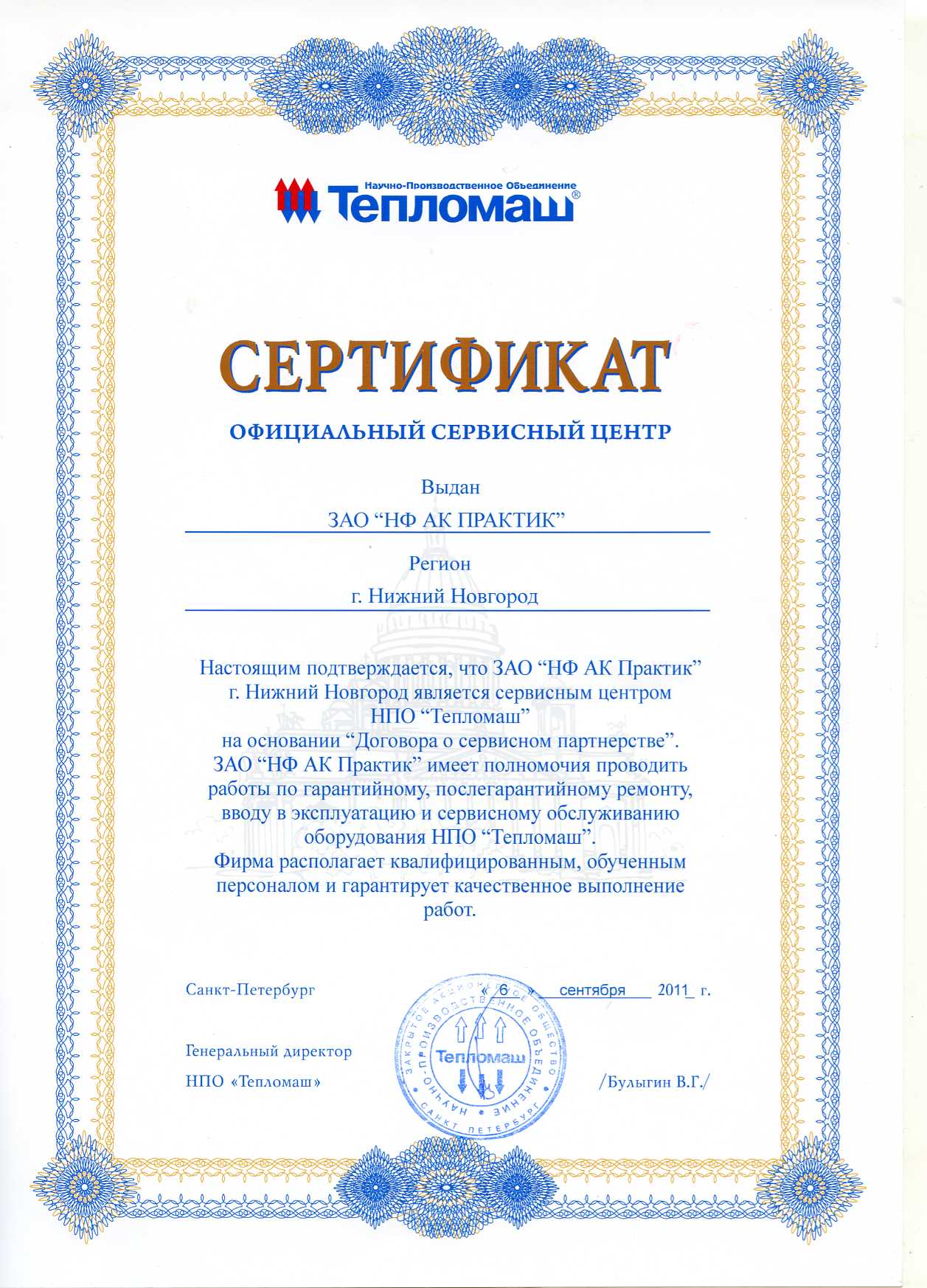 Сертификат официального сервисного центра НПО "Тепломаш"