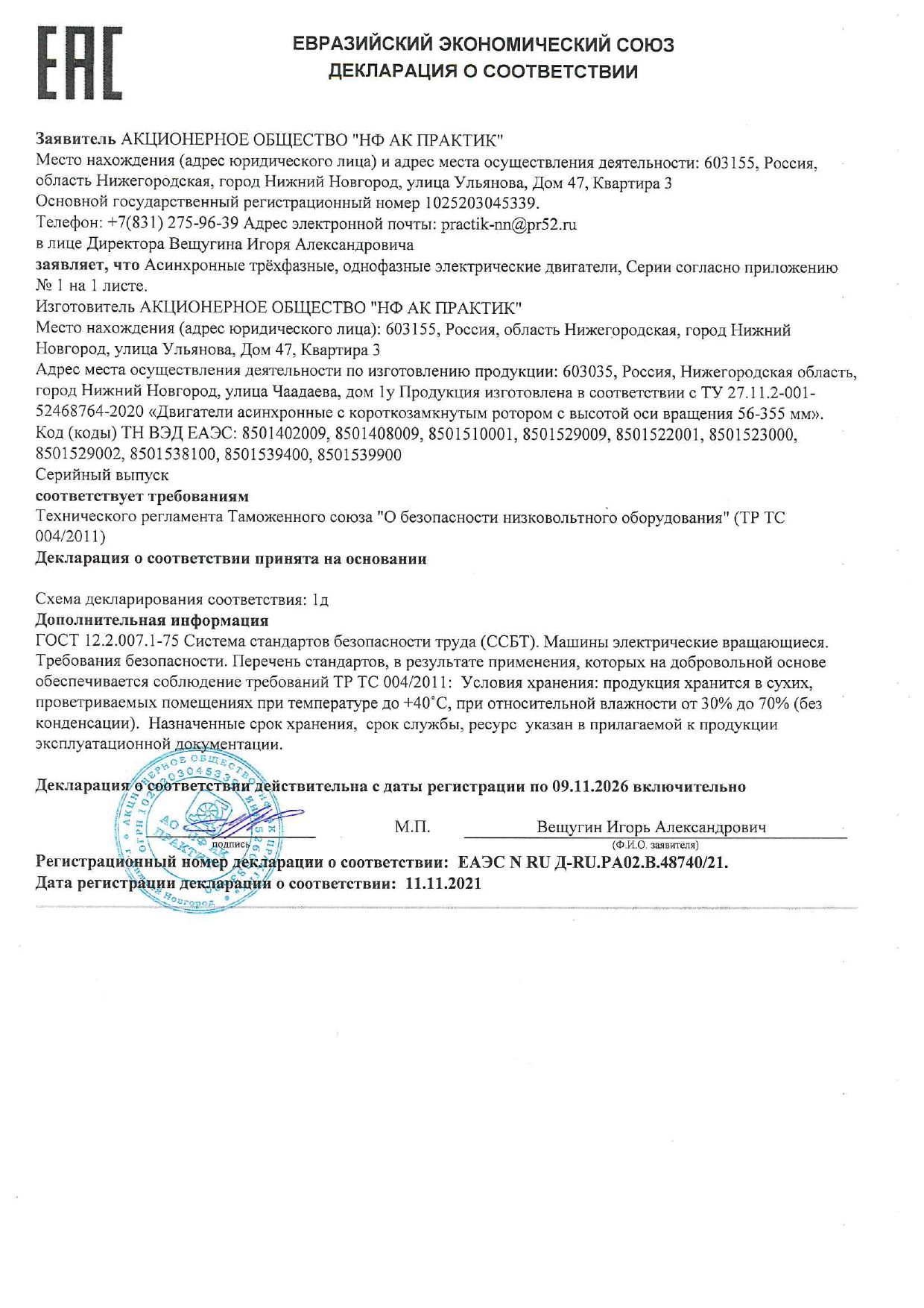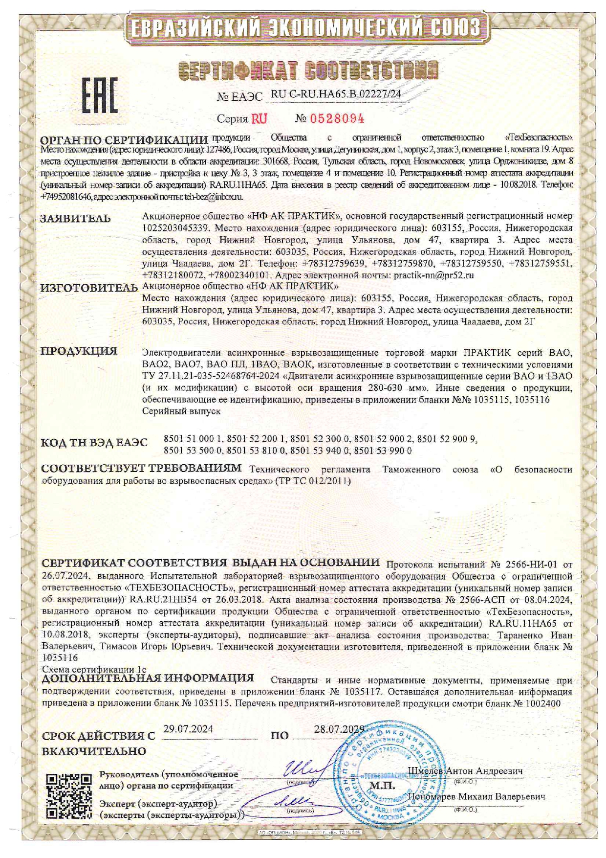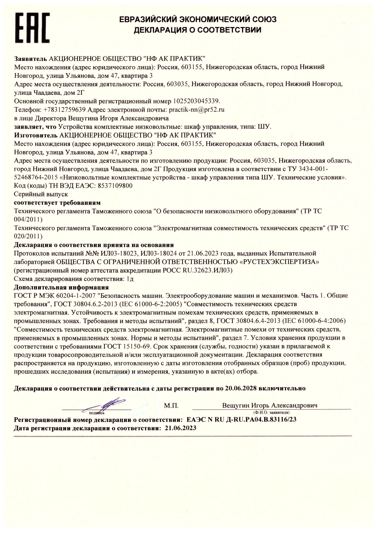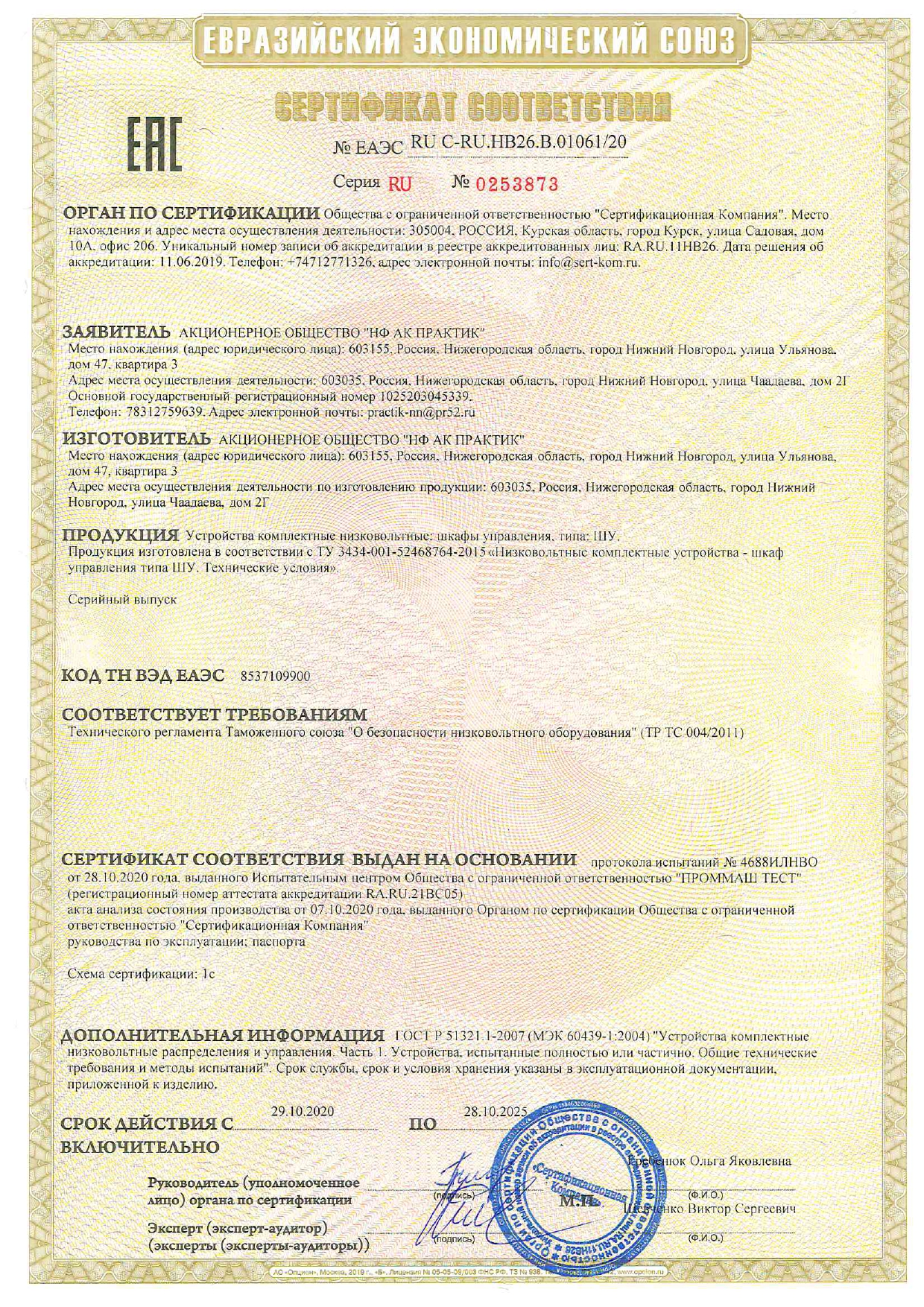 Сертификат соответствия на низковольтные комплектные устройства ТМ ПРАКТИК: шкафы управления типа ШУ