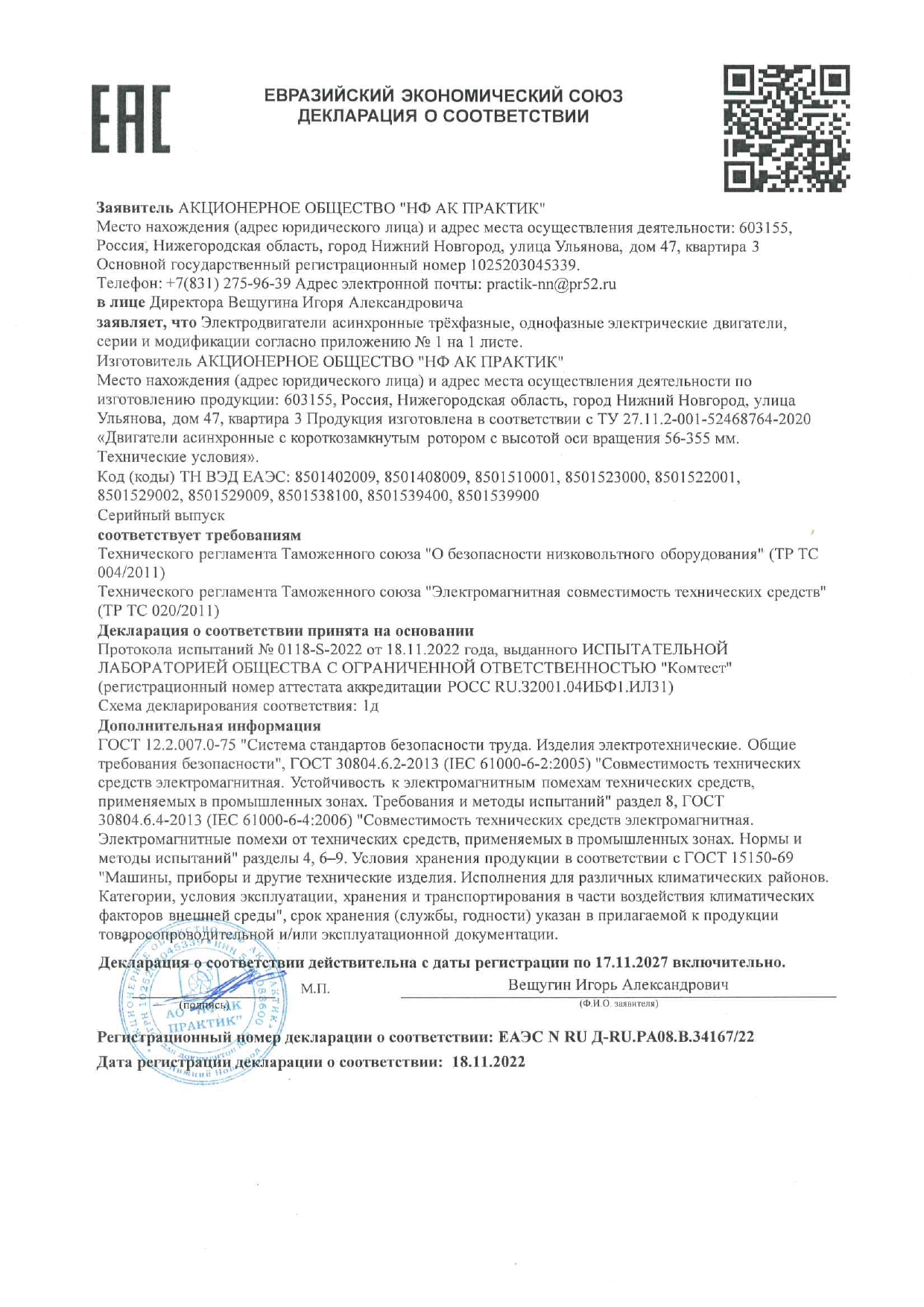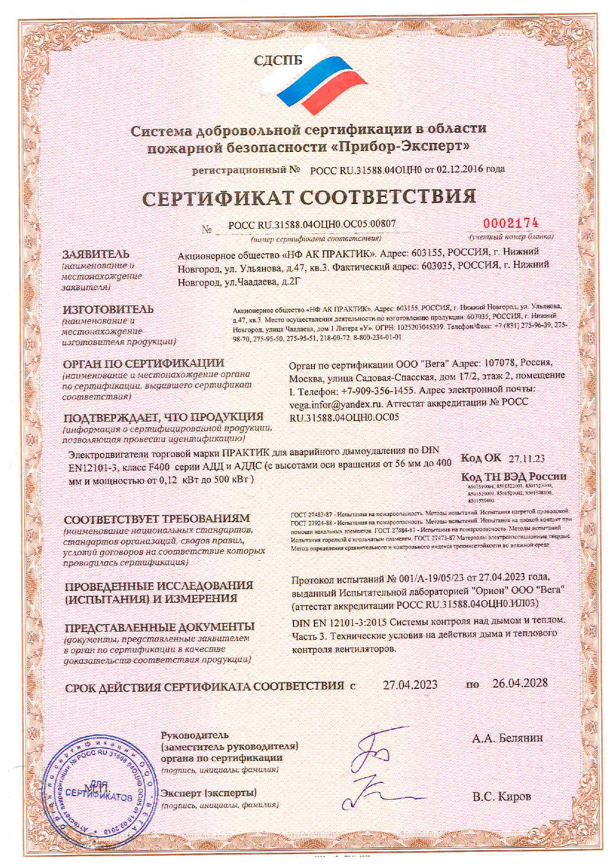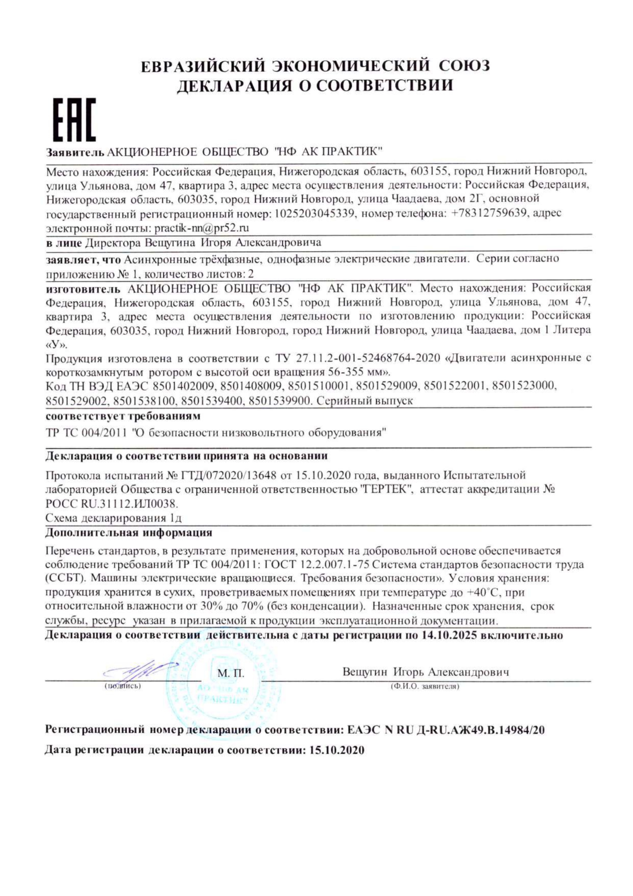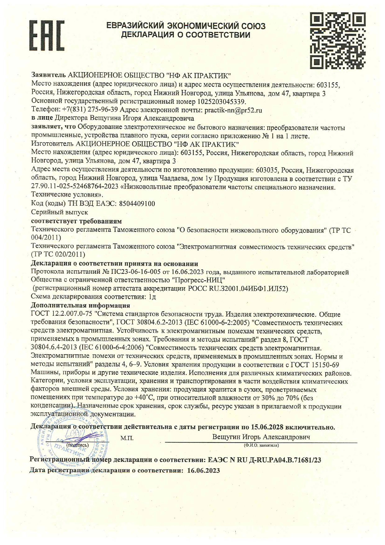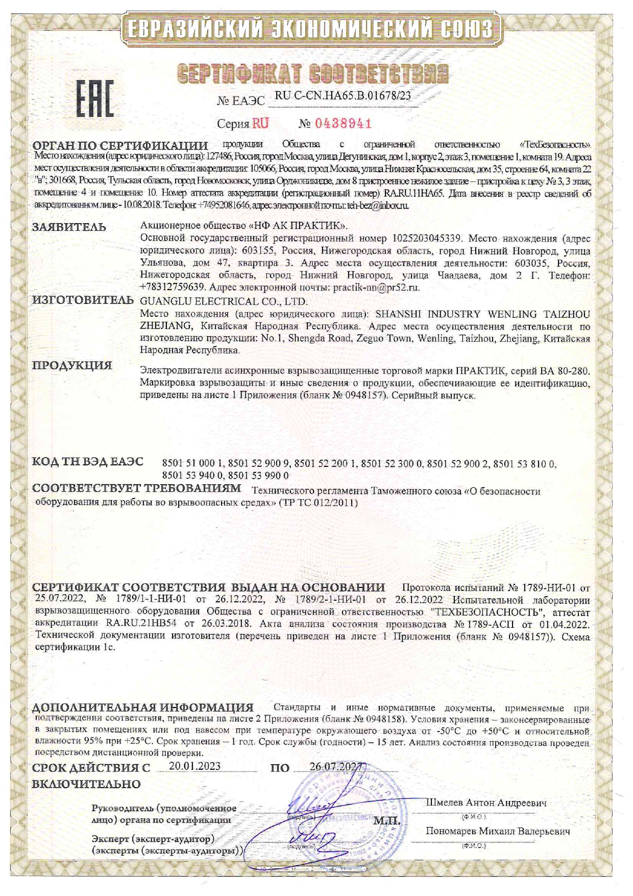Сертификат соответствия на низковольтные комплектные устройства ТМ ПРАКТИК: шкафы управления типа ШУ