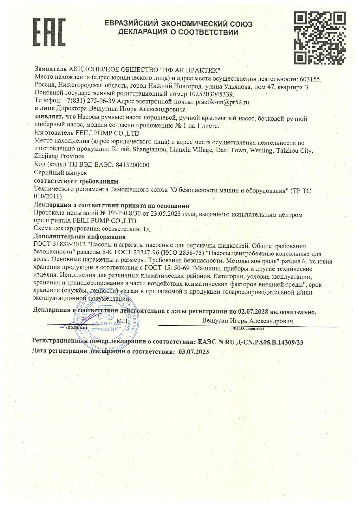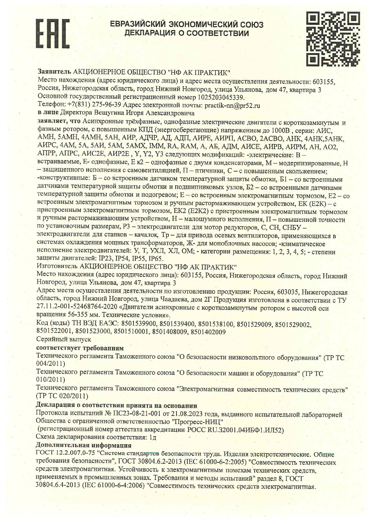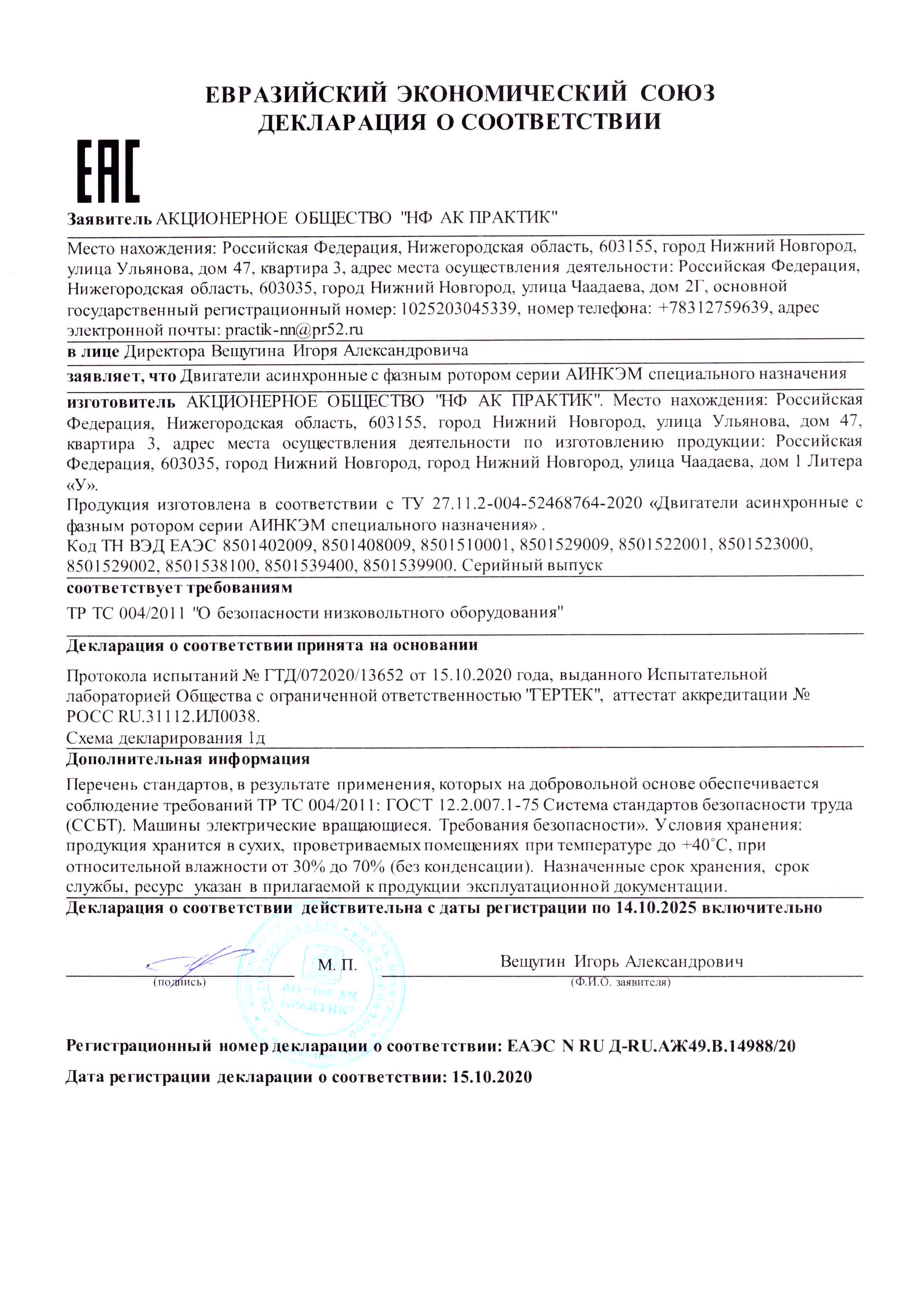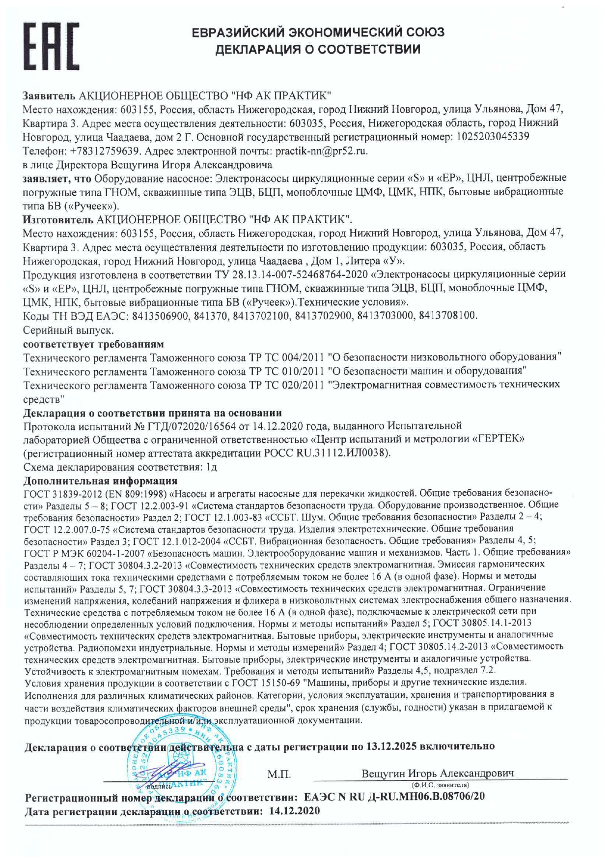 Сертификат соответствия на низковольтные комплектные устройства ТМ ПРАКТИК: шкафы управления типа ШУ