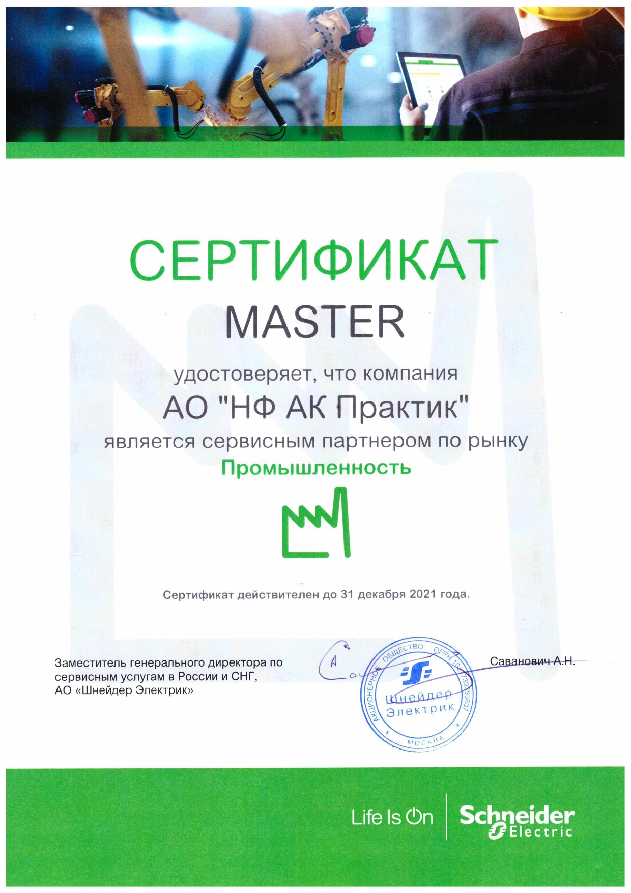 Сертификат Сервисного партнера Schneider Electric