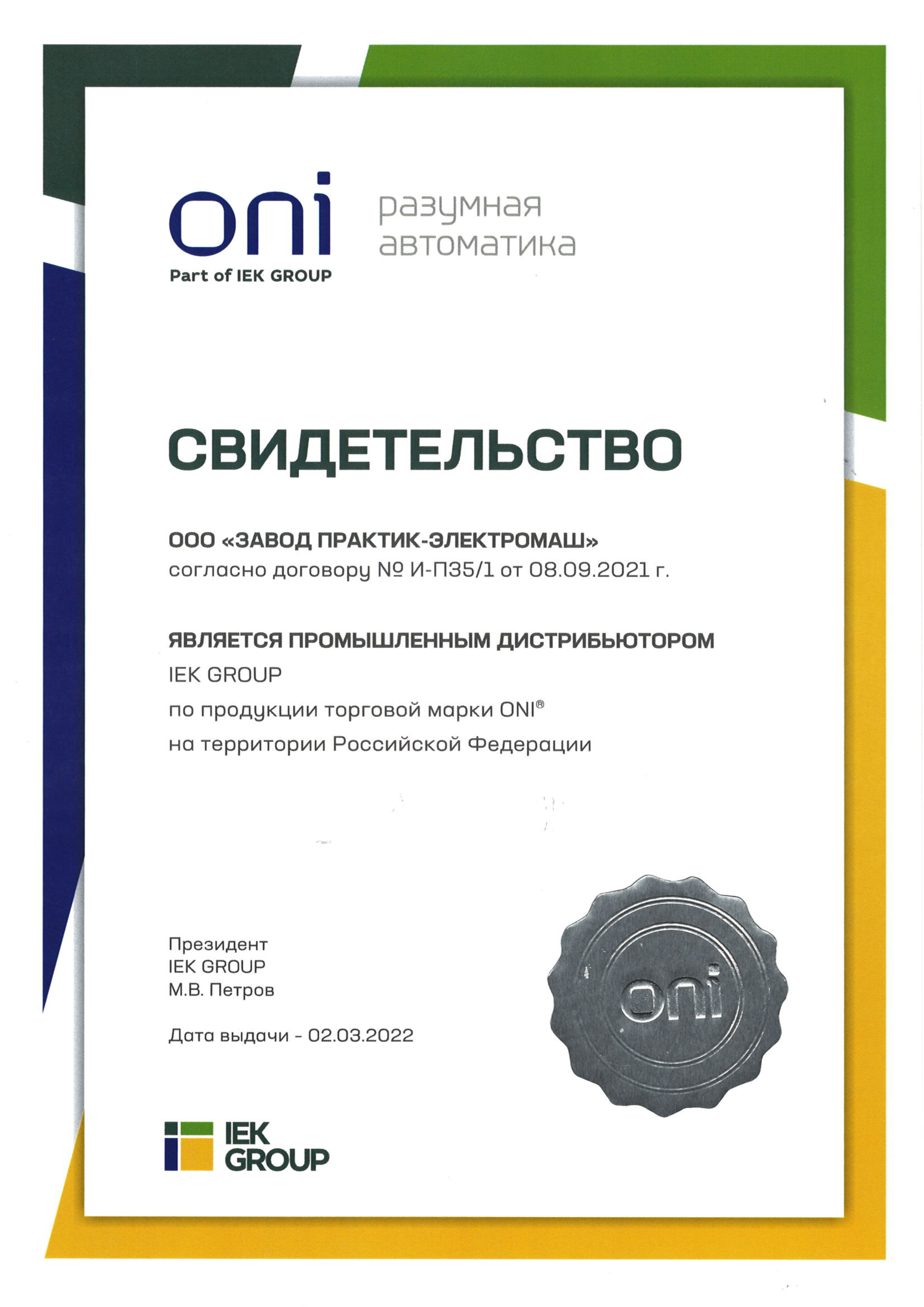 Свидетельство о промышленном дистрибьюторстве ООО «ИЭЕ ХОЛДИНГ»