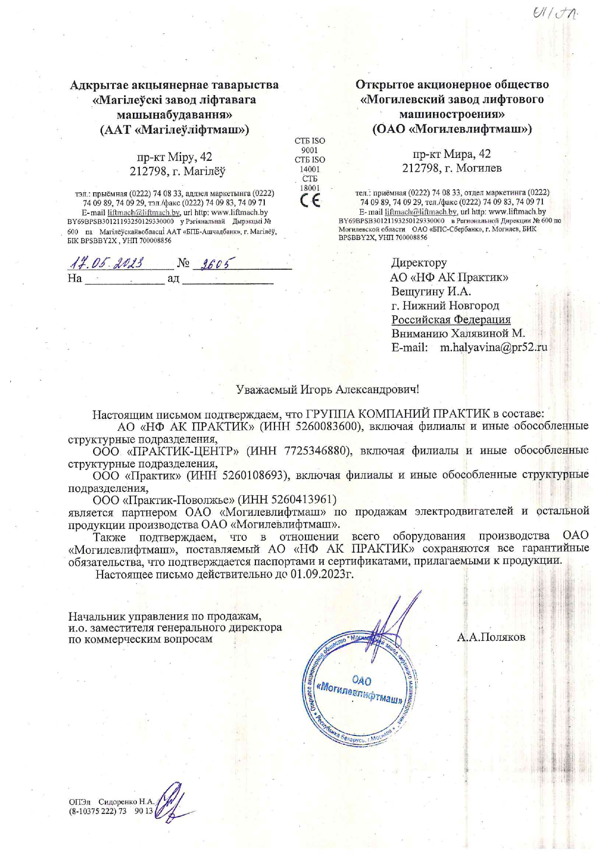 Письмо официального представителя ОАО "Могилевлифтмаш"