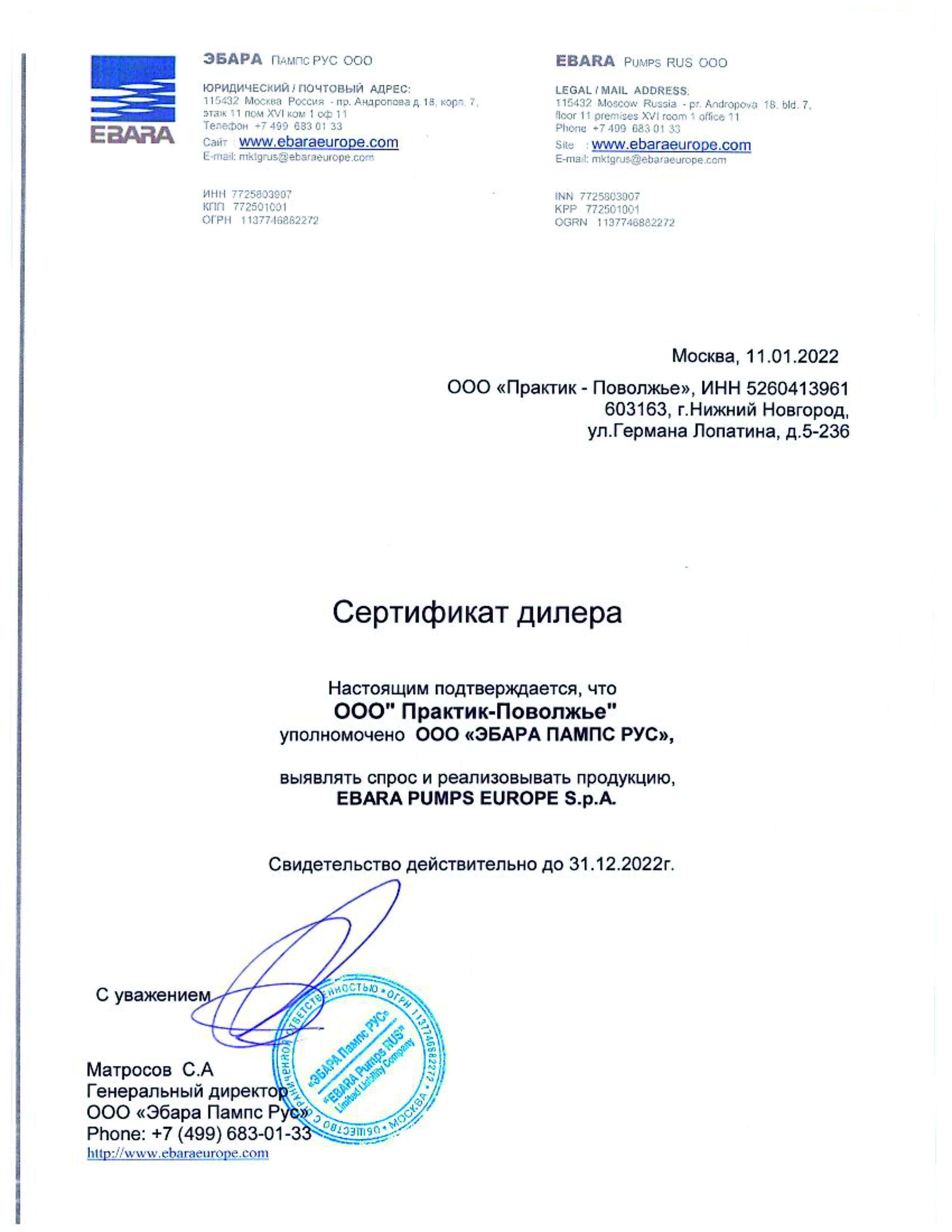 Сертификат дилера ООО "Эбара Пампс Рус"