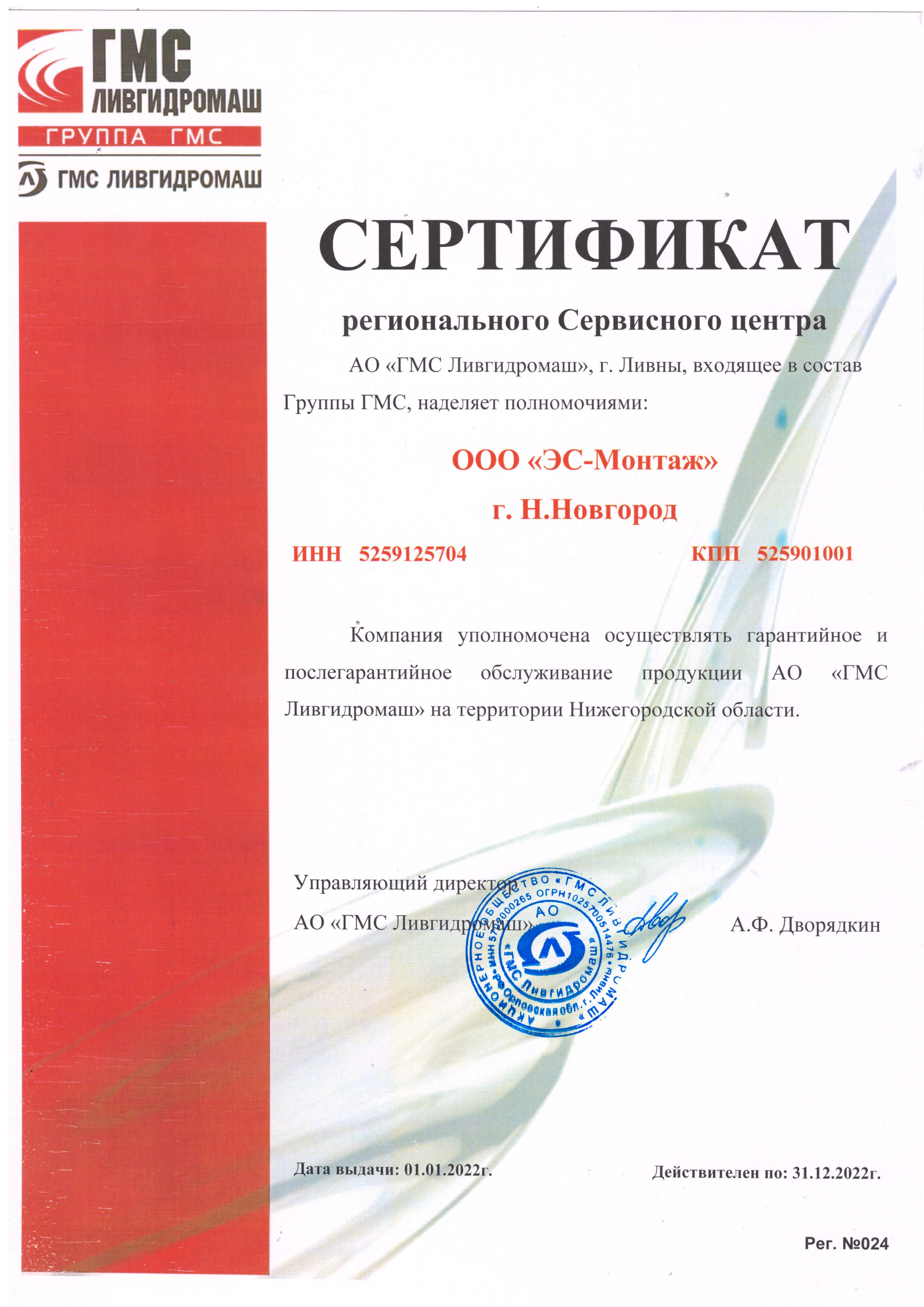 Сертификат сервисного центра АО "ГМС Ливгидромаш"
