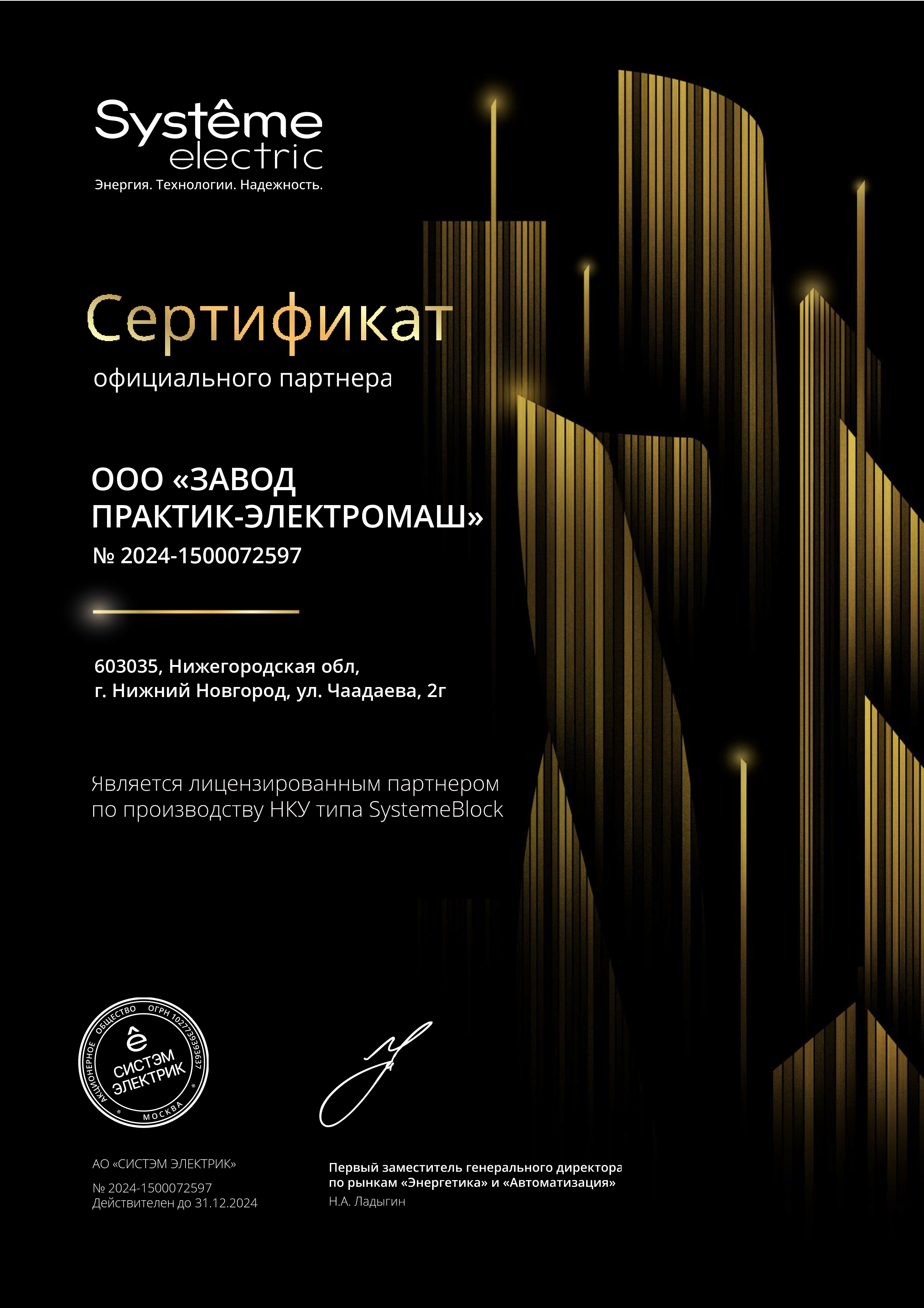 Сертификат лицензированного партнера АО «СИСТЭМ ЭЛЕКТРИК» по производству НКУ типа SystemeBlock