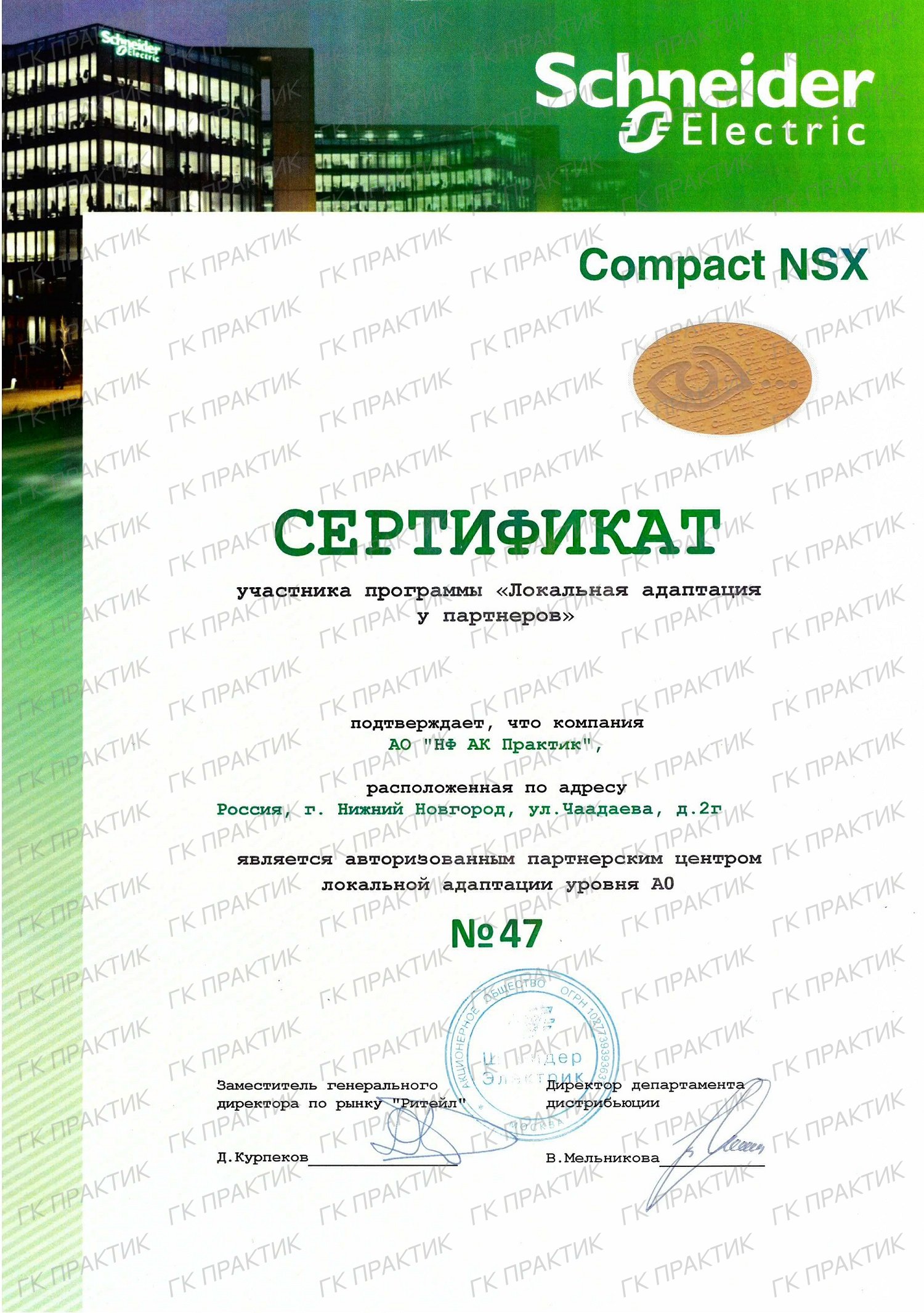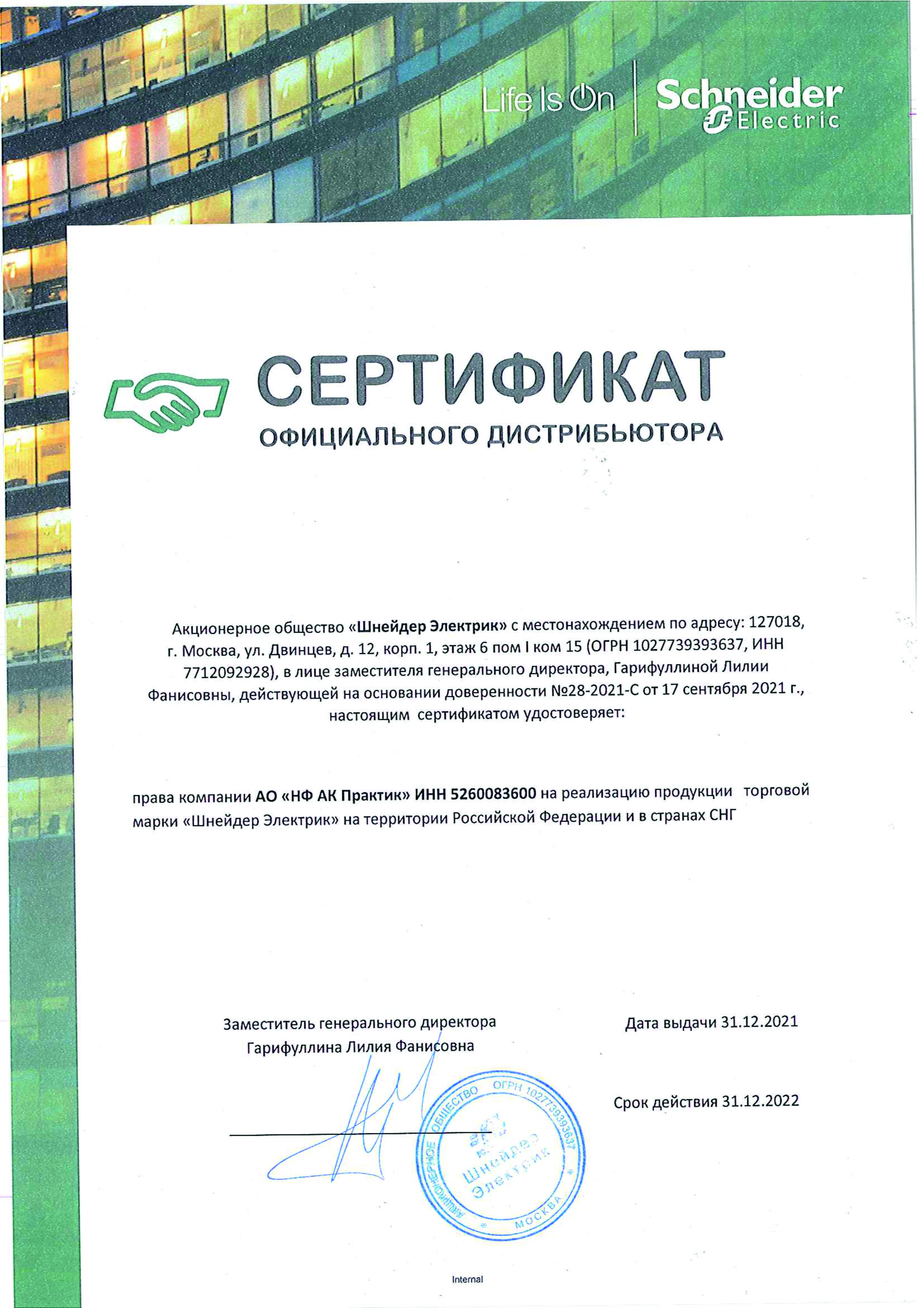 Сертификат официального дистрибьютора АО «Шнейдер Электрик»
