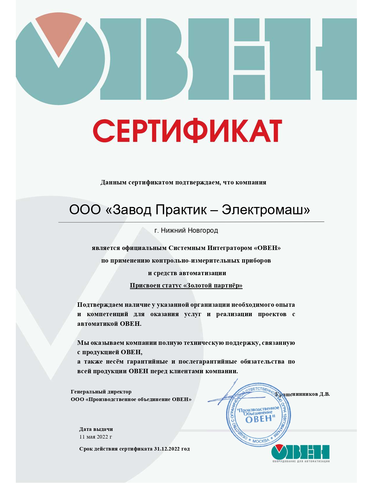 Сертификат официального системного интегратора "ОВЕН"