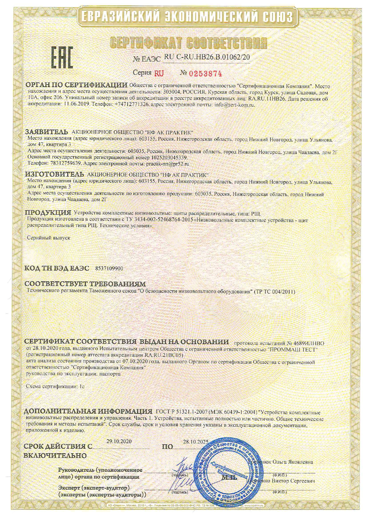Сертификат соответствия на низковольтные комплектные устройства ТМ ПРАКТИК: щиты распределительные типа РЩ