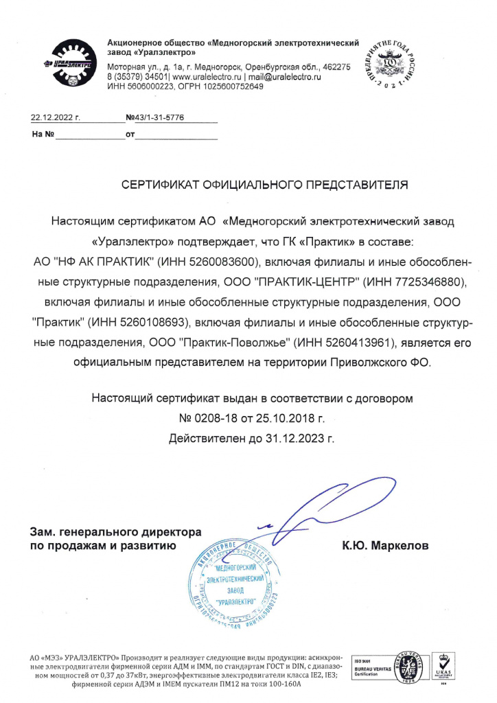 Сертификат официального представителя АО "Медногорский электротехнический завод "Уралэлектро"