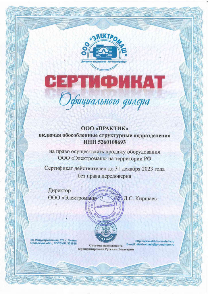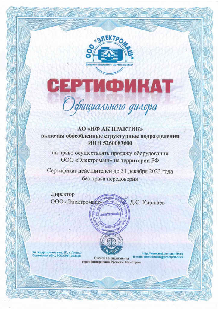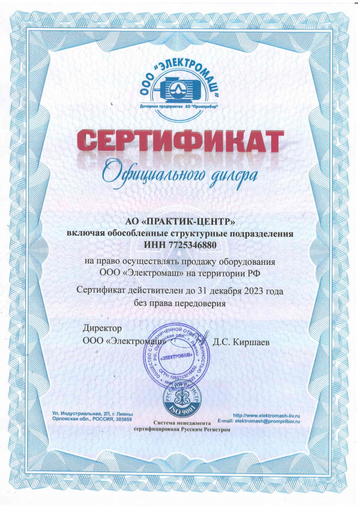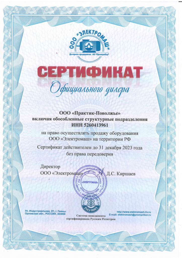 Сертификат официального дилера ООО "Электромаш"