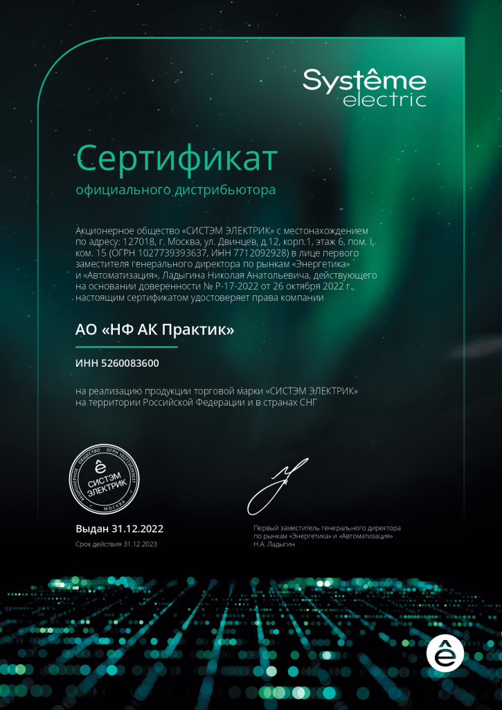 Сертификат официального дистрибьютера АО «СИСТЭМ ЭЛЕКТРИК»
