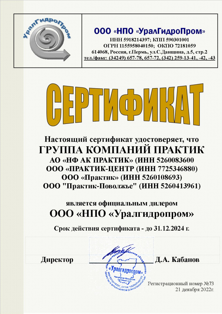 Сертификат дилера ООО "НПО УралГидроПром"