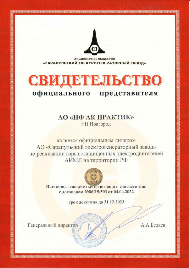 Свидетельство официального представителя АО "Сарапульский электрогенераторный завод"