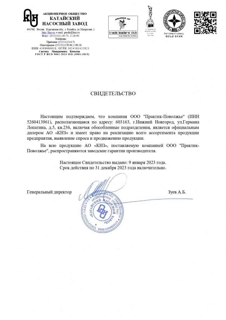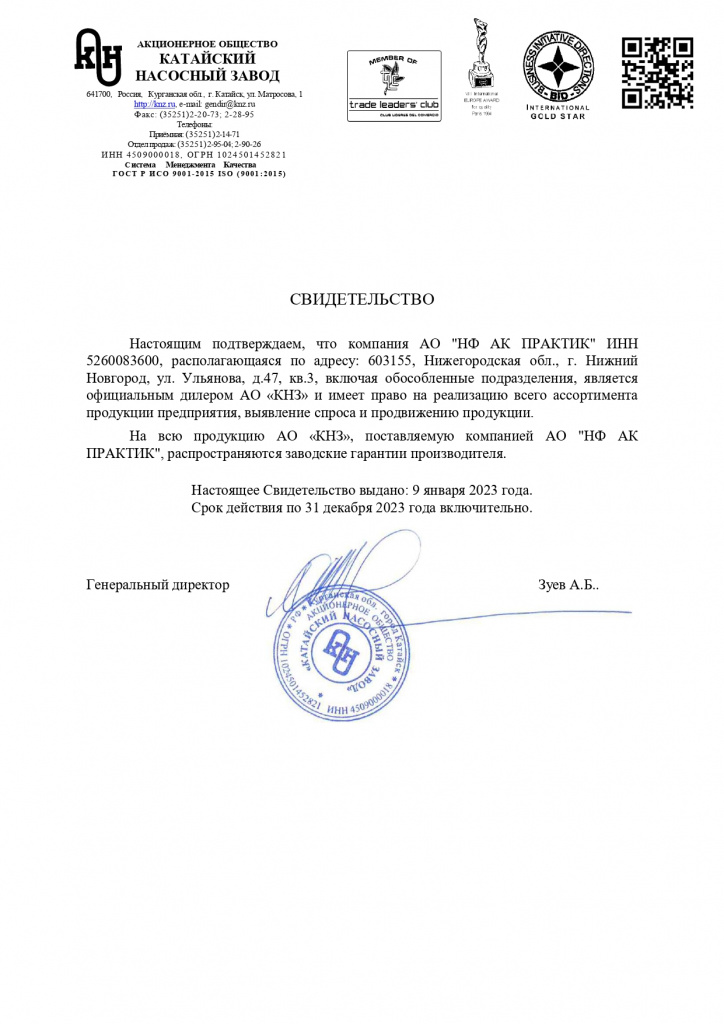 Сертификат официального дилера АО "Катайский насосный завод"