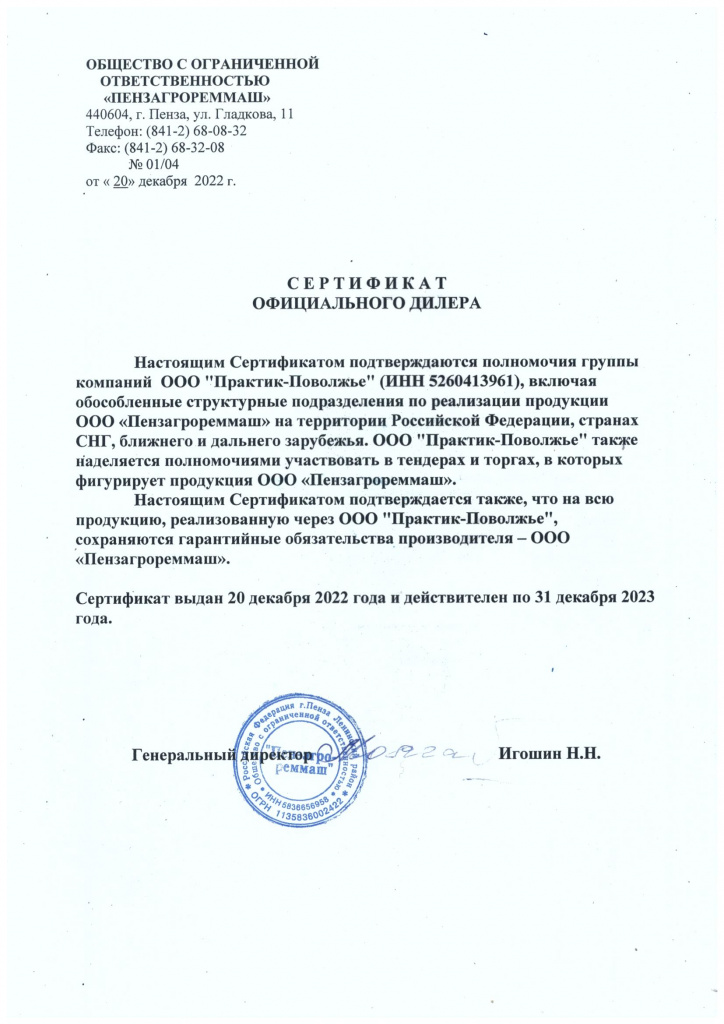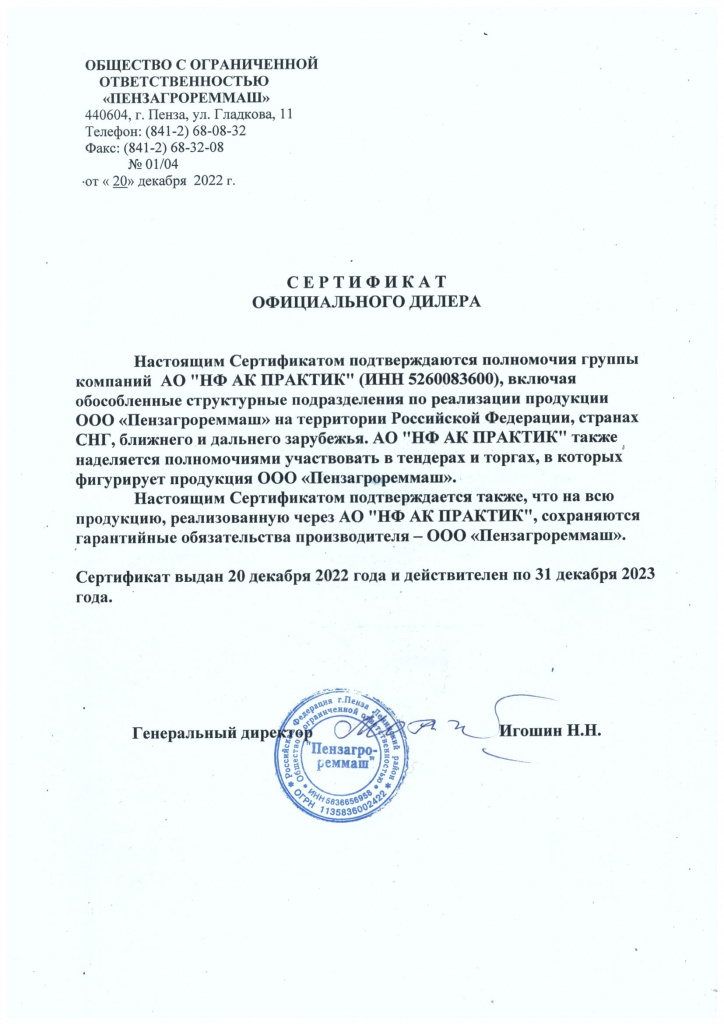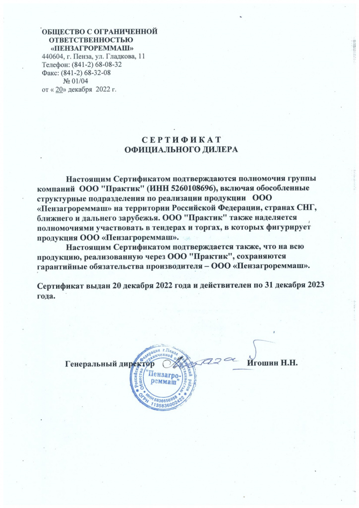 Сертификат дилера ООО "Пензагрореммаш"