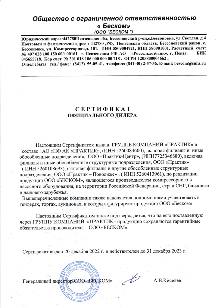 Сертификат дилера ООО "Беском"