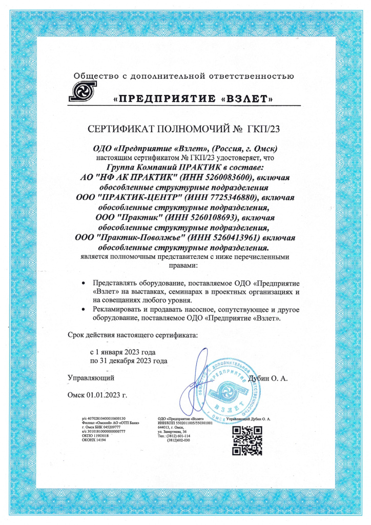 Сертификат полномочий ОДО "Предприятие "Взлет"