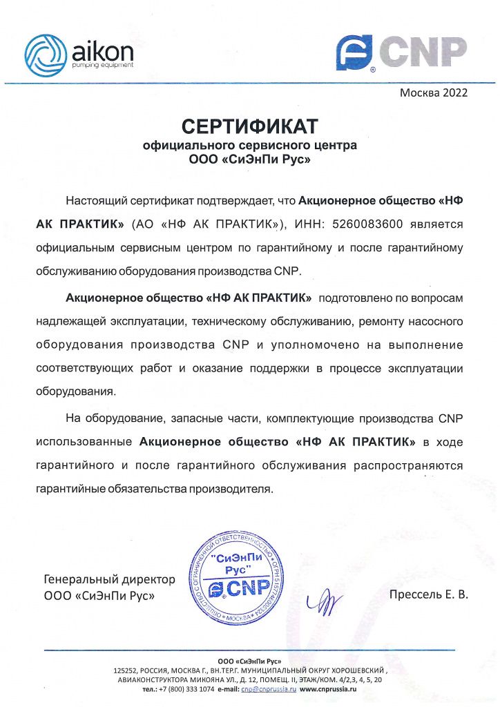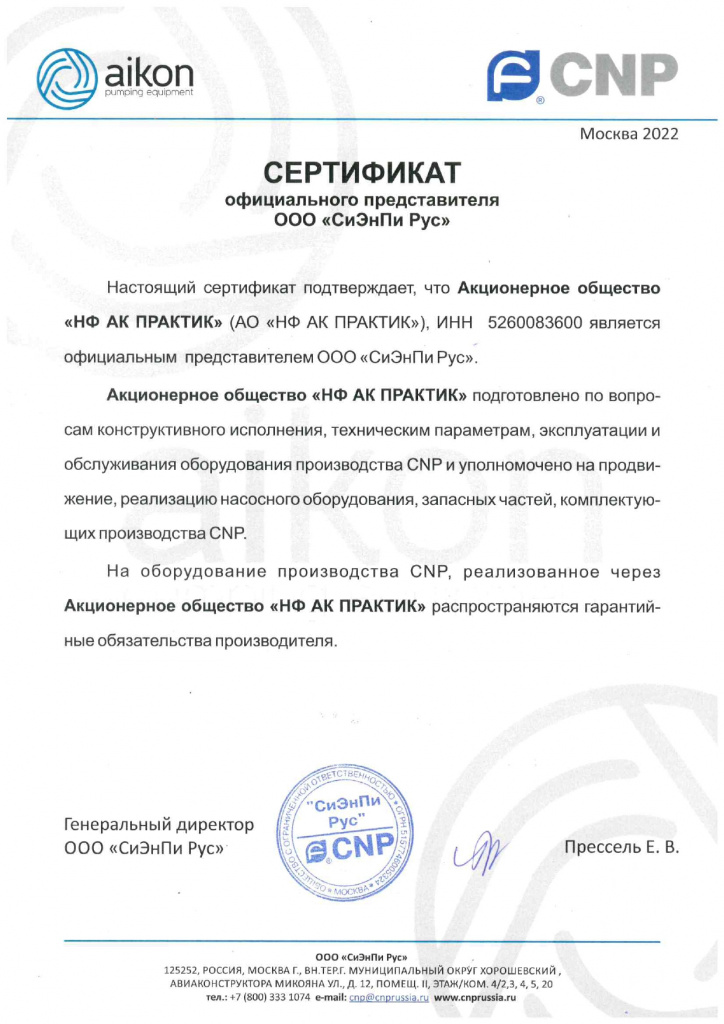 Сертификат официального представителя ООО "СиЭнПи Рус"