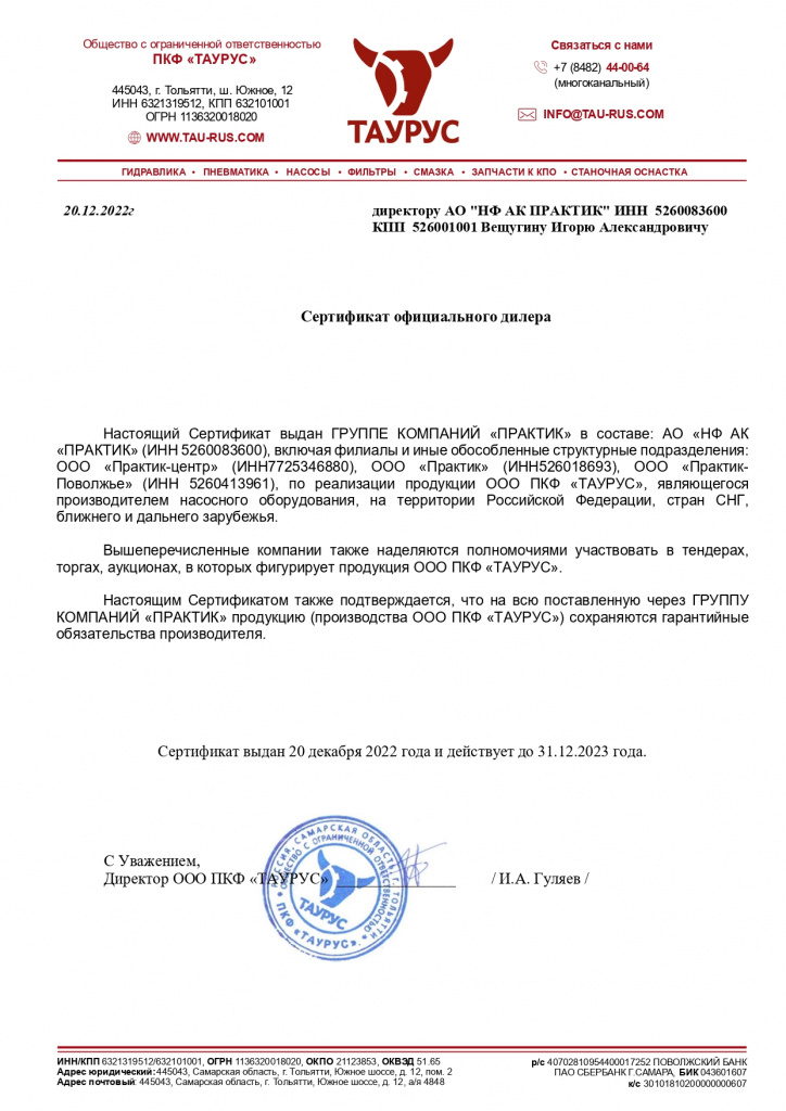 Сертификат официального дилера ООО ПКФ «ТАУРУС»