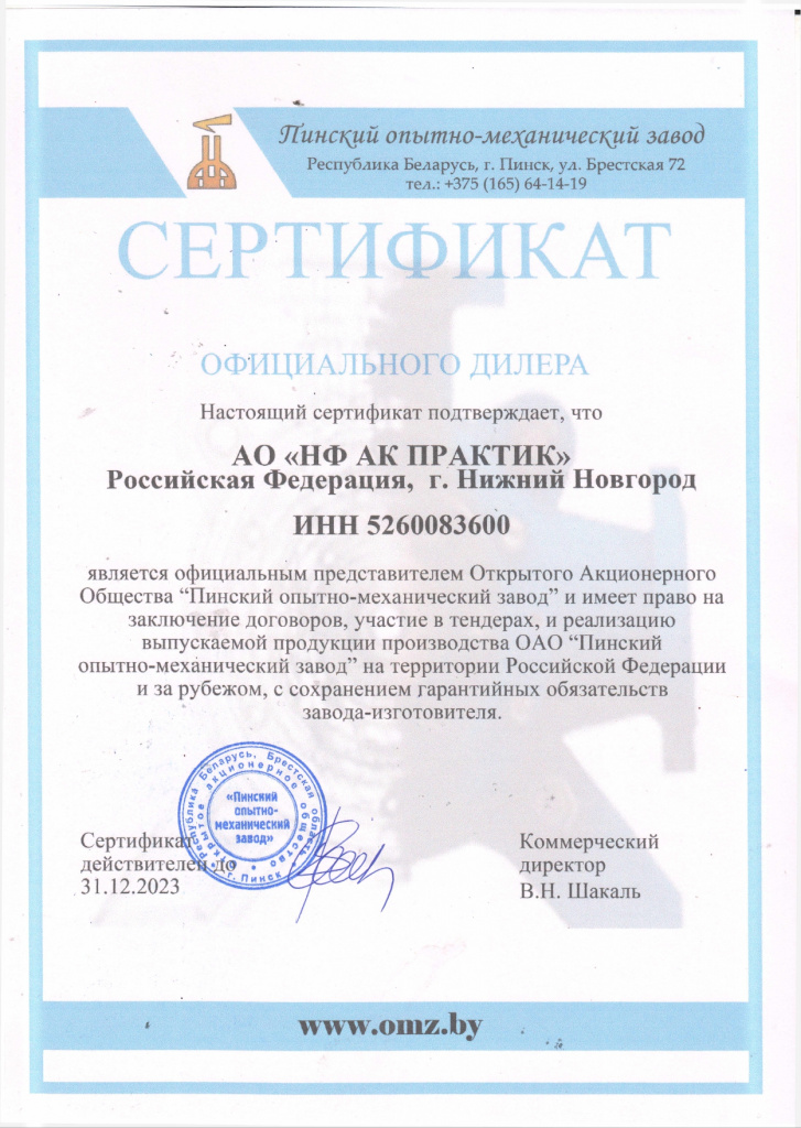 Сертификат дилера АО "Пинский опытно-механический завод"