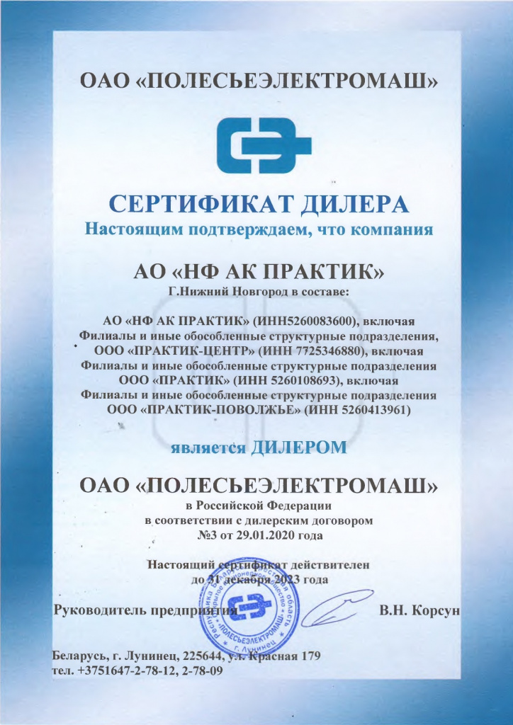 Сертификат дилера ОАО «ПОЛЕСЬЕЭЛЕКТРОМАШ»