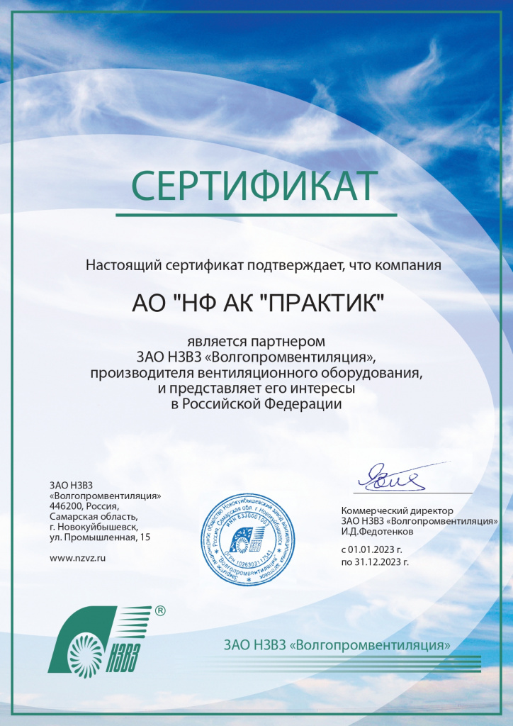 Сертификат партнера ЗАО НЗВЗ "Волгопромвентиляция"