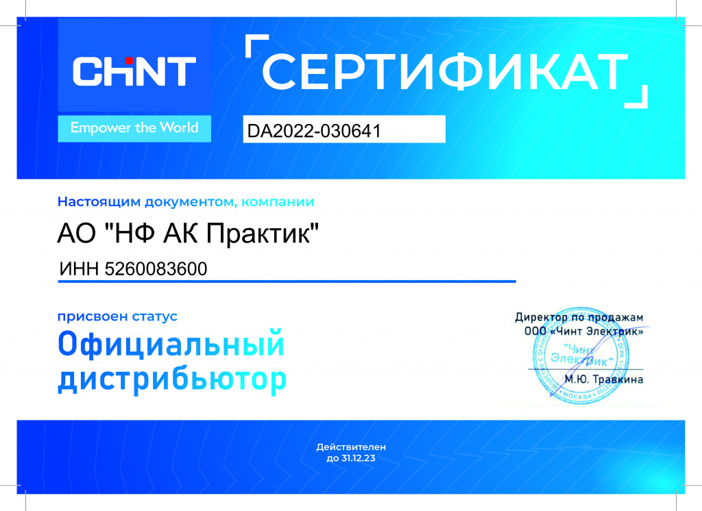 Сертификат официального дистрибьютора ООО «Чинт Электрик»