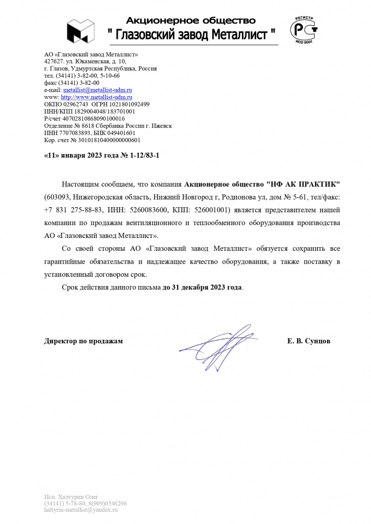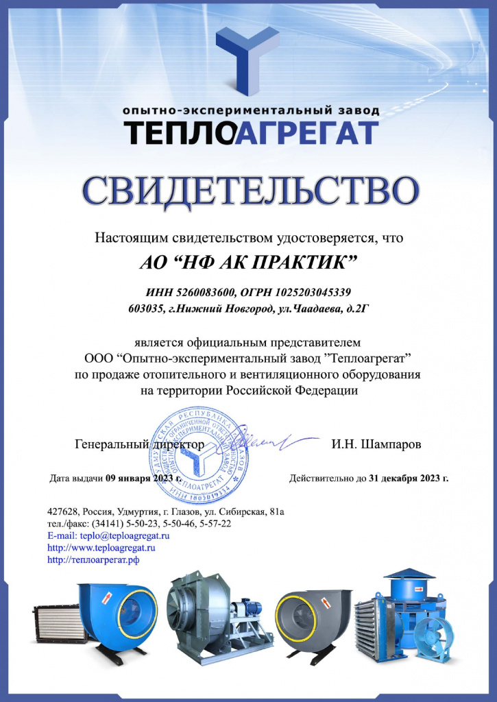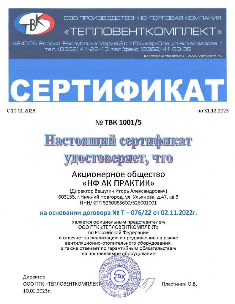 Сертификат официального представителя ООО ПТК "ТЕПЛОВЕНТКОМПЛЕКТ"