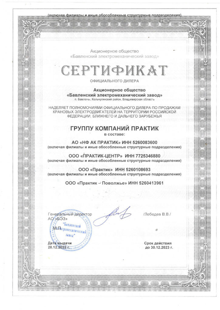 Сертификат официального дилера АО «Бавленский электромеханический завод»