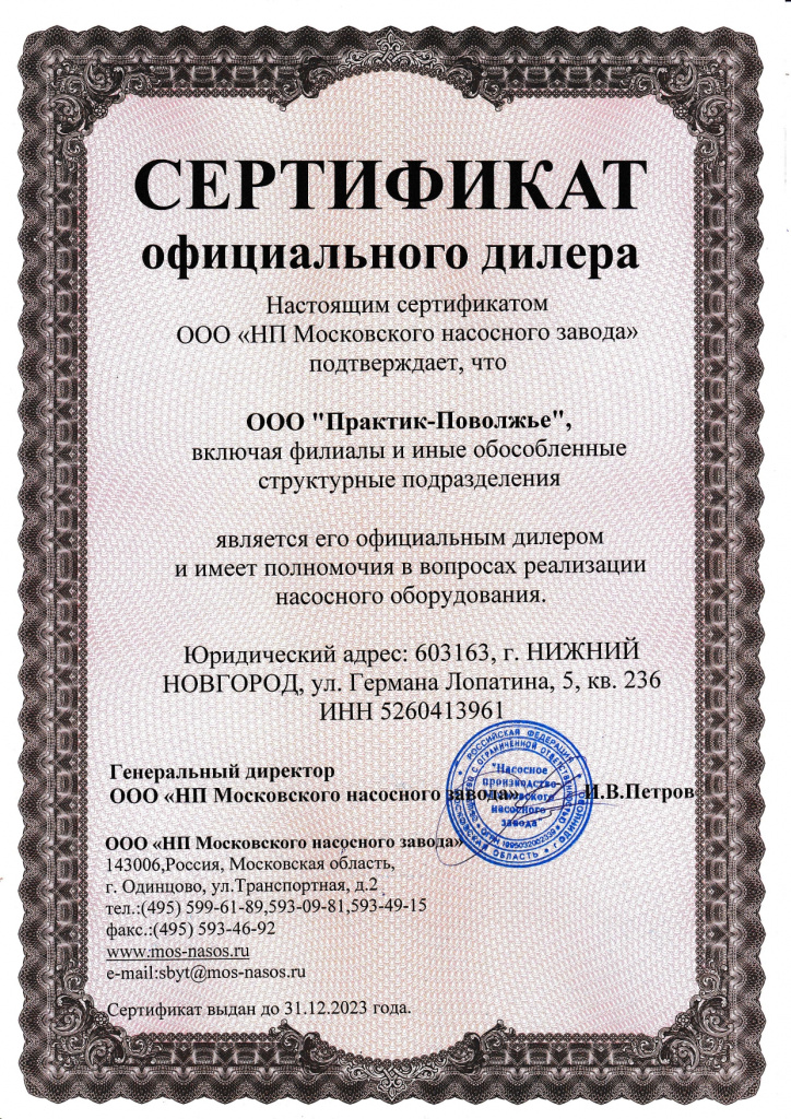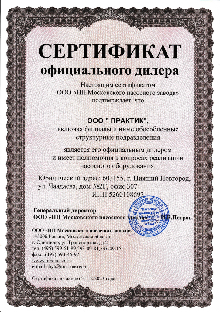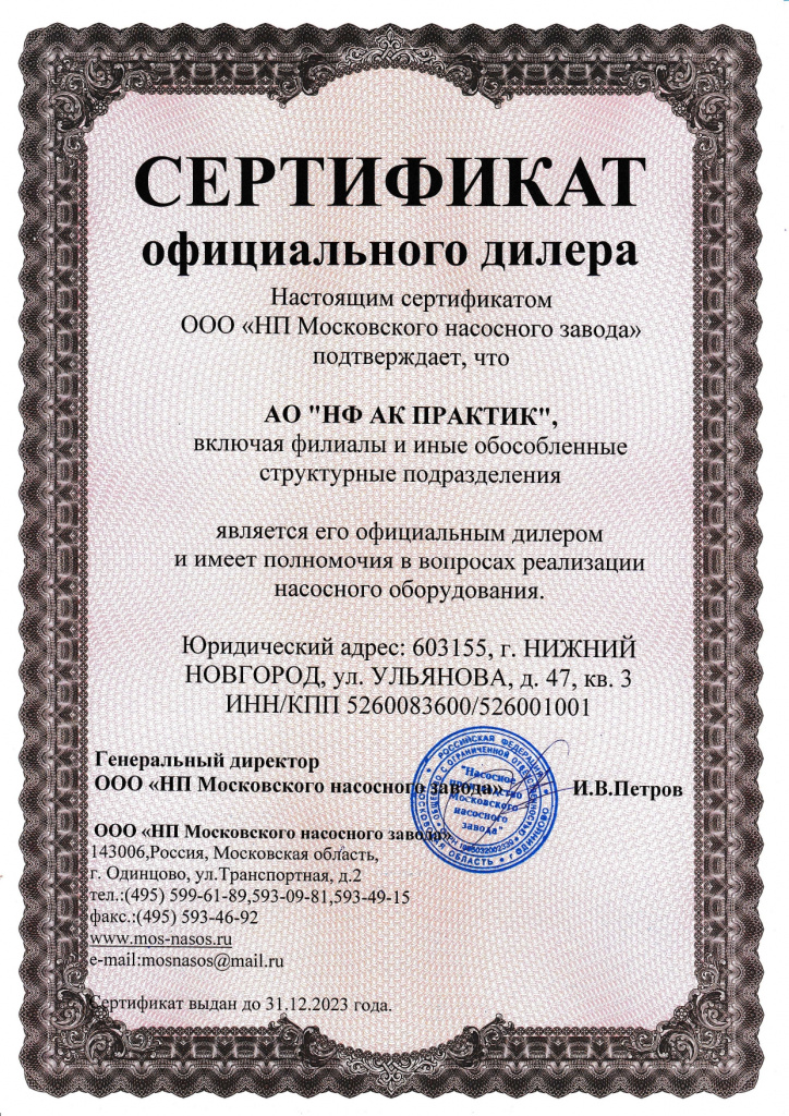 Сертификат официального дилера "НП Московского насосного завода"