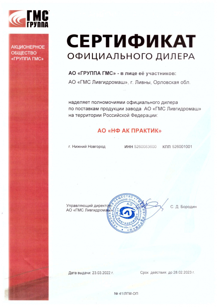 Сертификат официального дилера АО "ГРУППА ГМС"