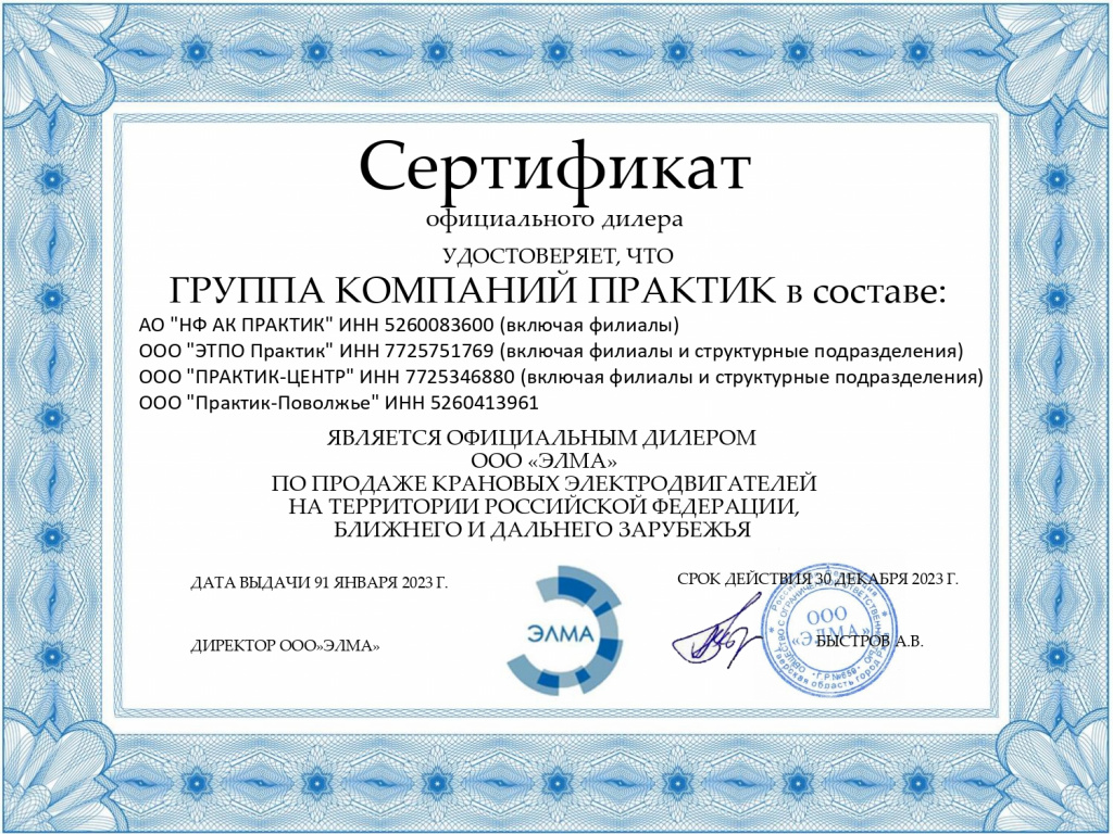 Сертификат официального дилера ООО "Элма"