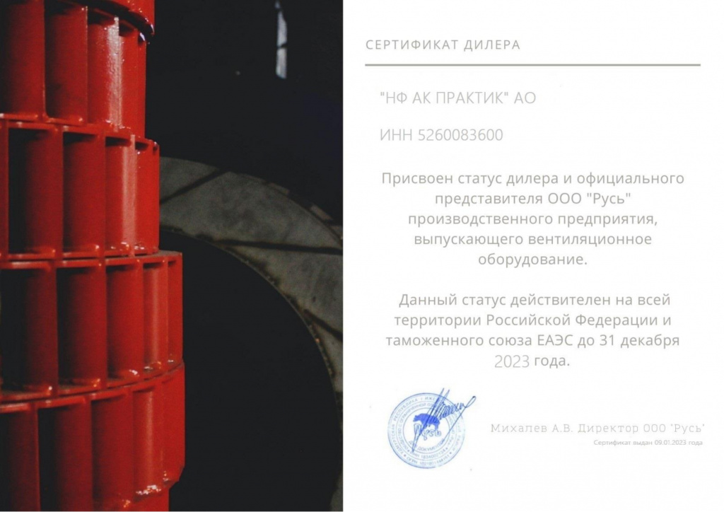 Сертификат дилера ООО "Русь"