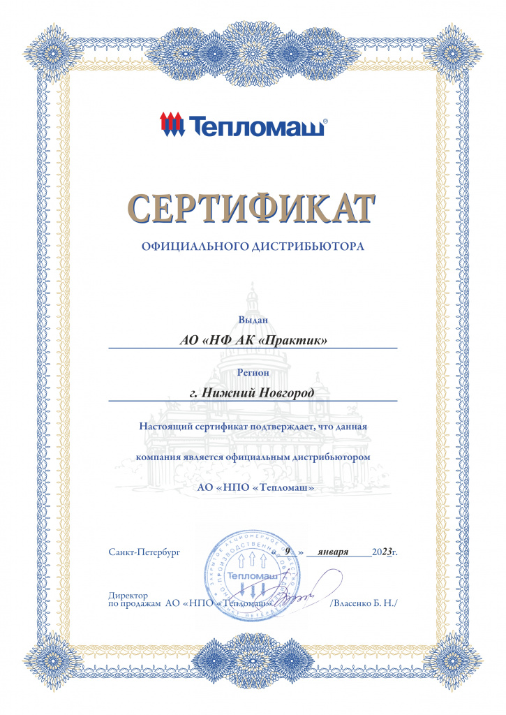 Сертификат официального дистрибьютора АО "НПО "Тепломаш"