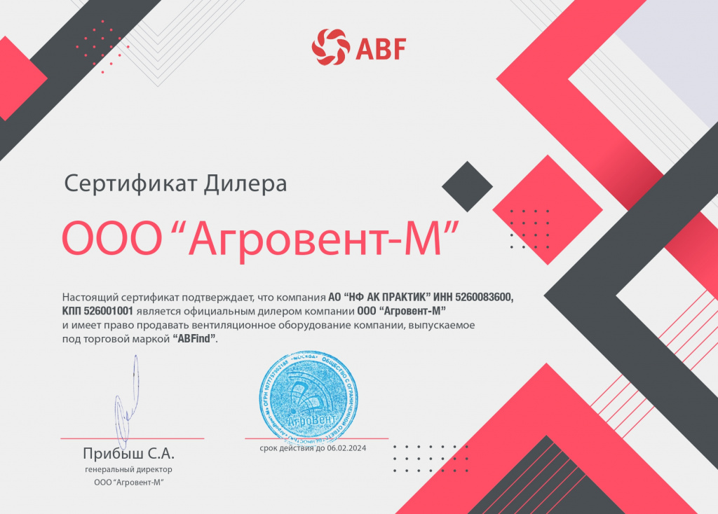 Сертификат дилера ООО "Агровент-М"